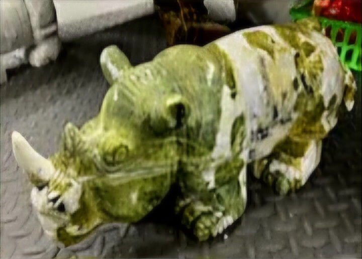 Overall, a Green and White Jade rhino sculpture is a captivating piece that melds natural beauty with artistic mastery. The contrasting yet complementary colors and smooth textures of the Jade enhance the powerful and majestic essence of the rhino, creating an object of both aesthetic and symbolic significance. This sculpture is not only a beautiful decorative item but also a meaningful and valuable work of art.