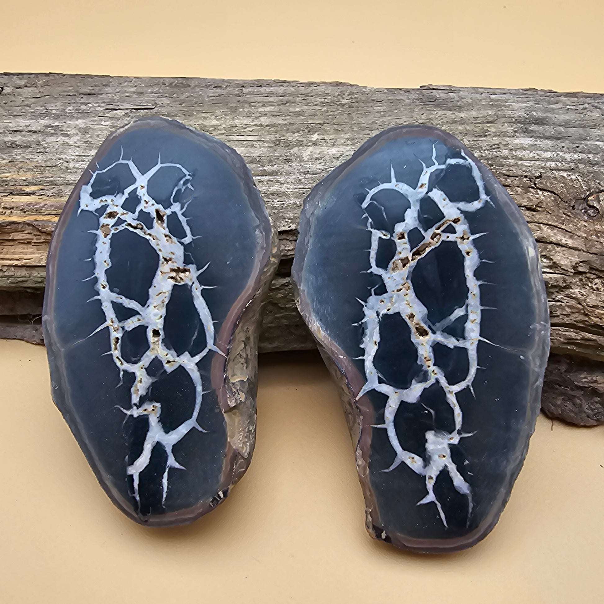 Septarian thunder eggs, also referred to as septarian nodules or septarian concretions, are spherical to ovoid-shaped structures that form naturally in sedimentary rocks. They typically consist of a combination of minerals, including calcite, aragonite, and occasionally barite, which precipitate out of groundwater and fill the cracks and cavities within the host rock.