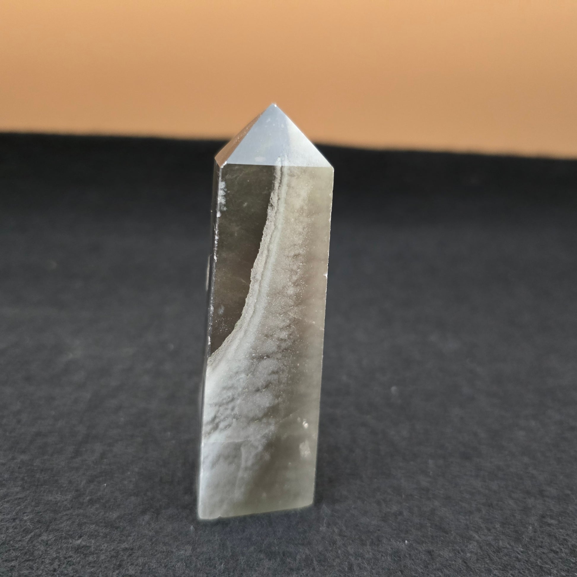 Sky Fluorite is a variety of the mineral fluorite, known for its striking sky-blue color. This semi-precious stone is highly prized for its clarity, color zoning, and overall aesthetic appeal. A Sky Fluorite tower typically features a polished, tapered structure that enhances its visual appeal and is often used as a decorative piece or for its metaphysical properties.