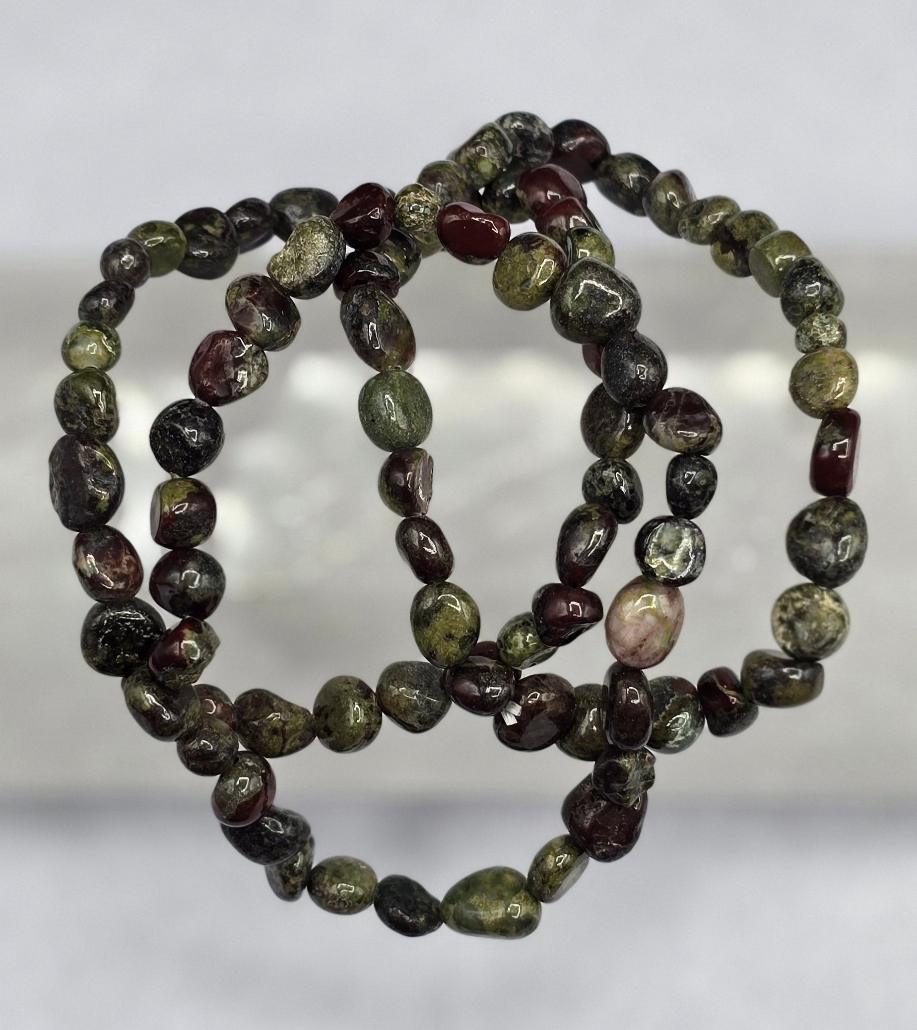 Dark Dragonsblood Stones: The bracelet features small, tumbled stones with a mythical essence known as Dark Dragonsblood. These stones are characterized by their deep, mystical shades, reminiscent of the powerful and ancient blood of dragons. The colors may range from dark reds and purples to inky blacks, creating an aura of mystery and magic.