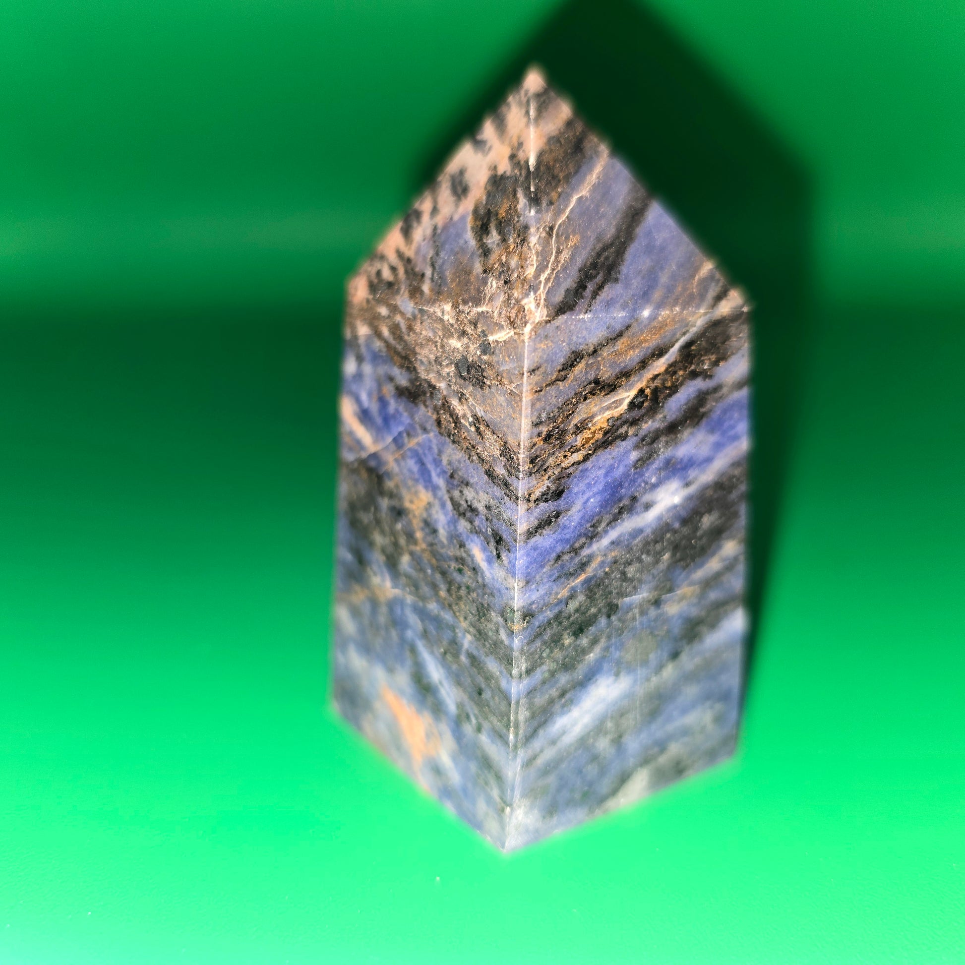 Sodalite is a deep blue mineral often interspersed with white calcite veins, giving it a distinctive appearance reminiscent of a starry night sky or ocean waves. A sodalite tower is typically crafted into a tapered, polished structure, showcasing the stone's natural beauty and enhancing its metaphysical properties.