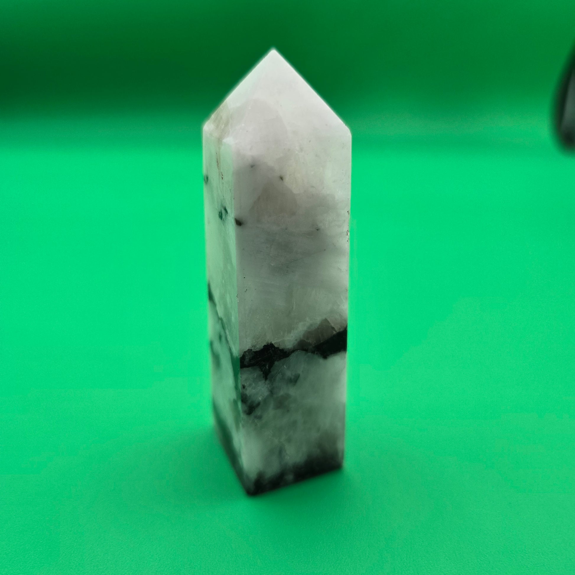 A White Moonstone tower is a polished, often pointed piece of White Moonstone shaped into a tower or obelisk form. Towers are used in energy healing and metaphysical practices to direct and amplify energy.